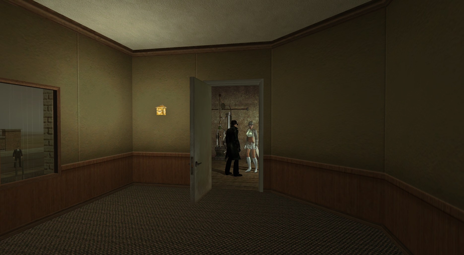 She looks at me with big eyes and nods. We quickly exit the lab, moving down the hall.. Second ring, near the end of the hall, I'm now walking much faster.. Sounds like it's coming from the conference room.. Third ring, I'm almost to the conference room door, Urchin is tracking right behind me.. As I open the door, I see a man with his back to us; he interrupts the fourth ring by picking up the handset, placing it to his ear, and saying, "I'm in." Gently dropping the handset back into it's cradle, and turning to face us, the Alchemist says with a big smile, "Did you miss me?"